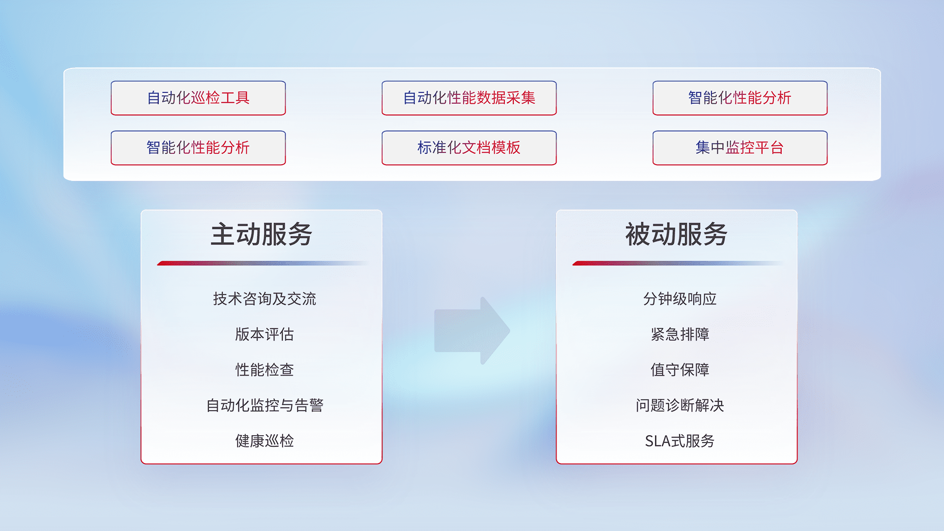 智能化工具和标准化文档,,保障服务质量,,,提供主动服务(包含技术咨询、、、版本评估、、性能检查、、自动化监控与告警、、健康巡检)和被动服务包含(分钟级响应、、、、紧急排障、、、值守保障、、、问题诊断解决、、SLA服务)。。。。