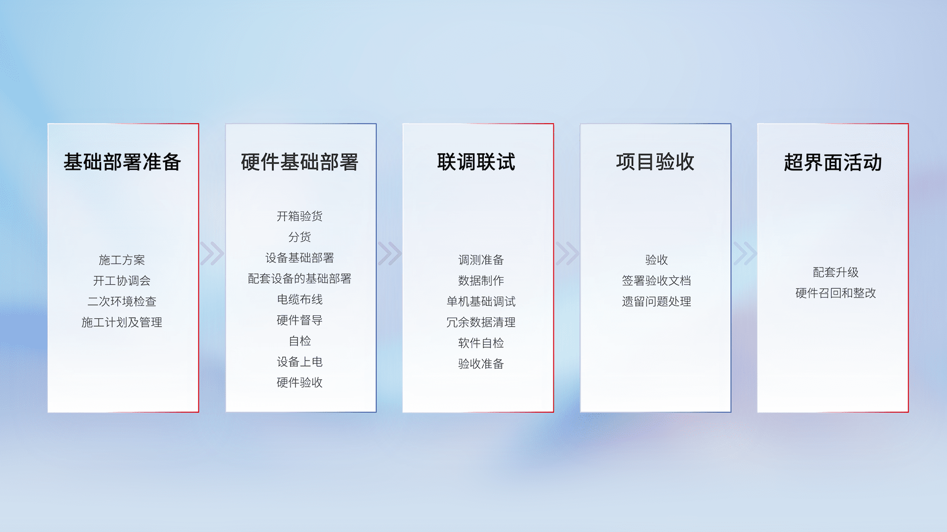 从基础部署准备、、、硬件基础部署、、联调联试、、项目验收、、越界面活动的全过程可追溯,,,保证施工质量和进度。。。。